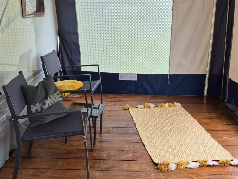 Draussen gemütlicher Sitzplatz im Vorzelt
